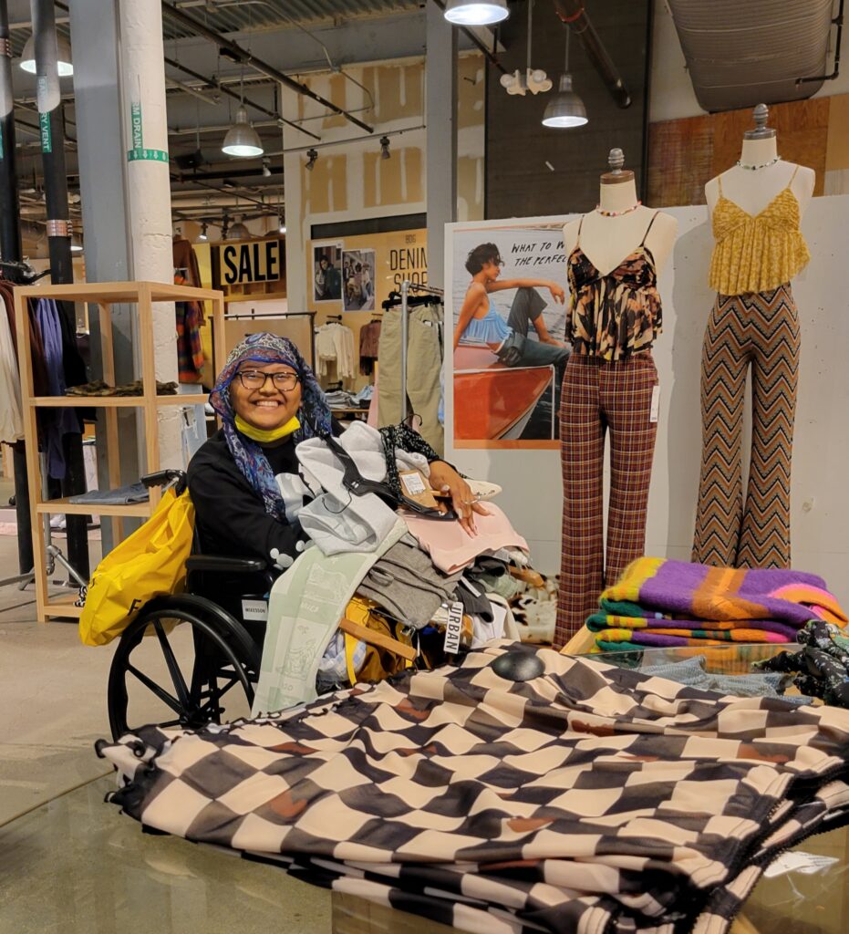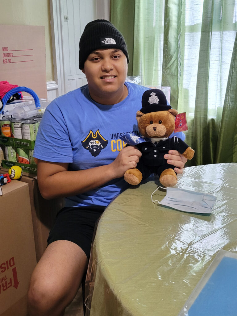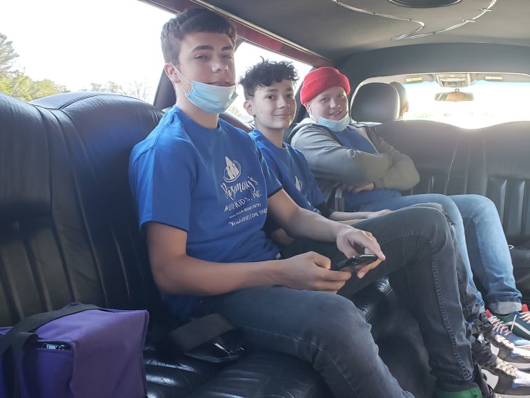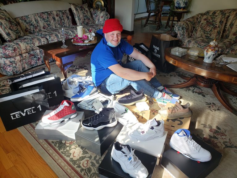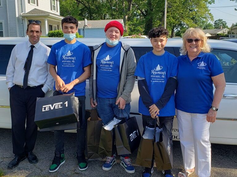 “Shopping Spree Wish” > Jakob, age 19 from Rumford went via a big stretch limo from Arrow Prestige Limousine Service to Braintree Mall. Along with Jakob was his grandmother, Sharon and 2 buddies! After a great lunch at Buffalo Wild Wings it was off to lots of shopping. He really likes his sneakers! See if you can count how many he is surrounded with! (May 2021)